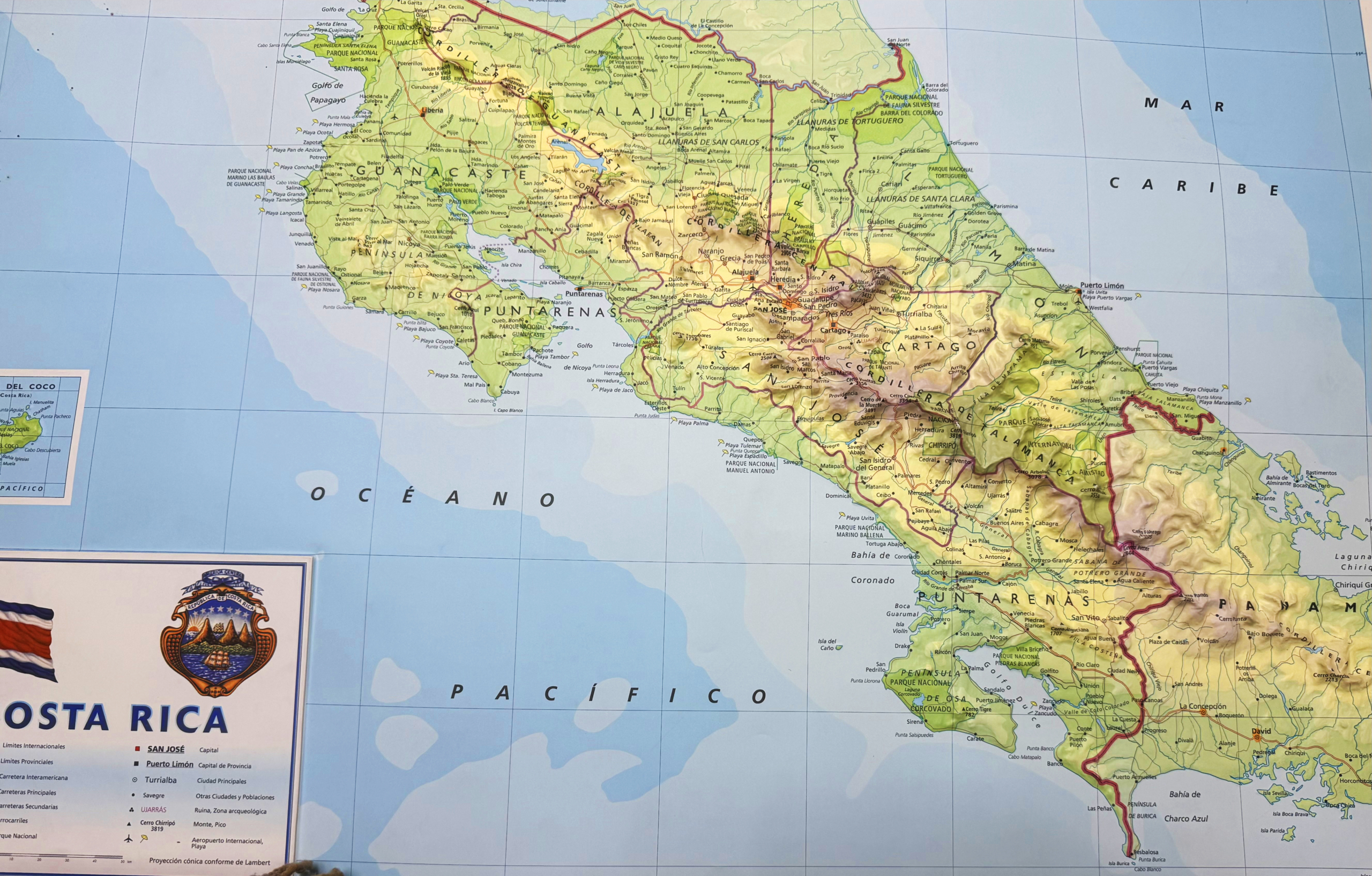 The colorful map depicts in detail the relief of Costa Rica through the use of hypsometric tints and height spot, clearly illustrating plains, mountain ranges, valleys, peaks, and hydrographic features such as rivers and lakes.