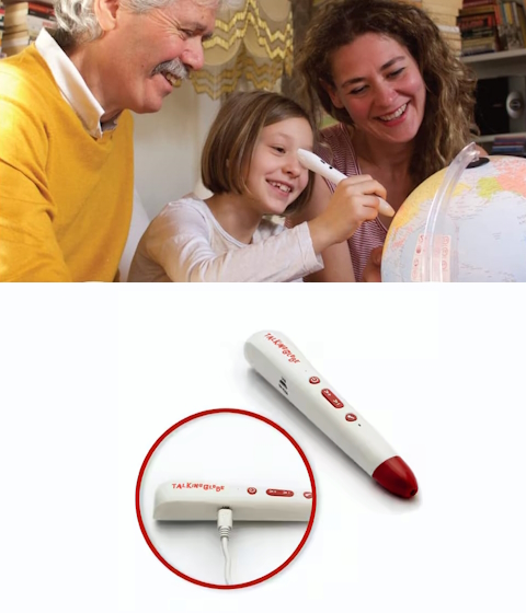 The included electronic pen provides information in six languages (English, French, German, Italian, Spanish, and Portuguese) pen when it comes in contact with the globe. It provides details about all countries such as the capital city, the population, the spoken languages, geographical data, important and interesting facts, as well as an audio playback of the national anthem. The electronic pen also allows the user to increase or decrease the volume.